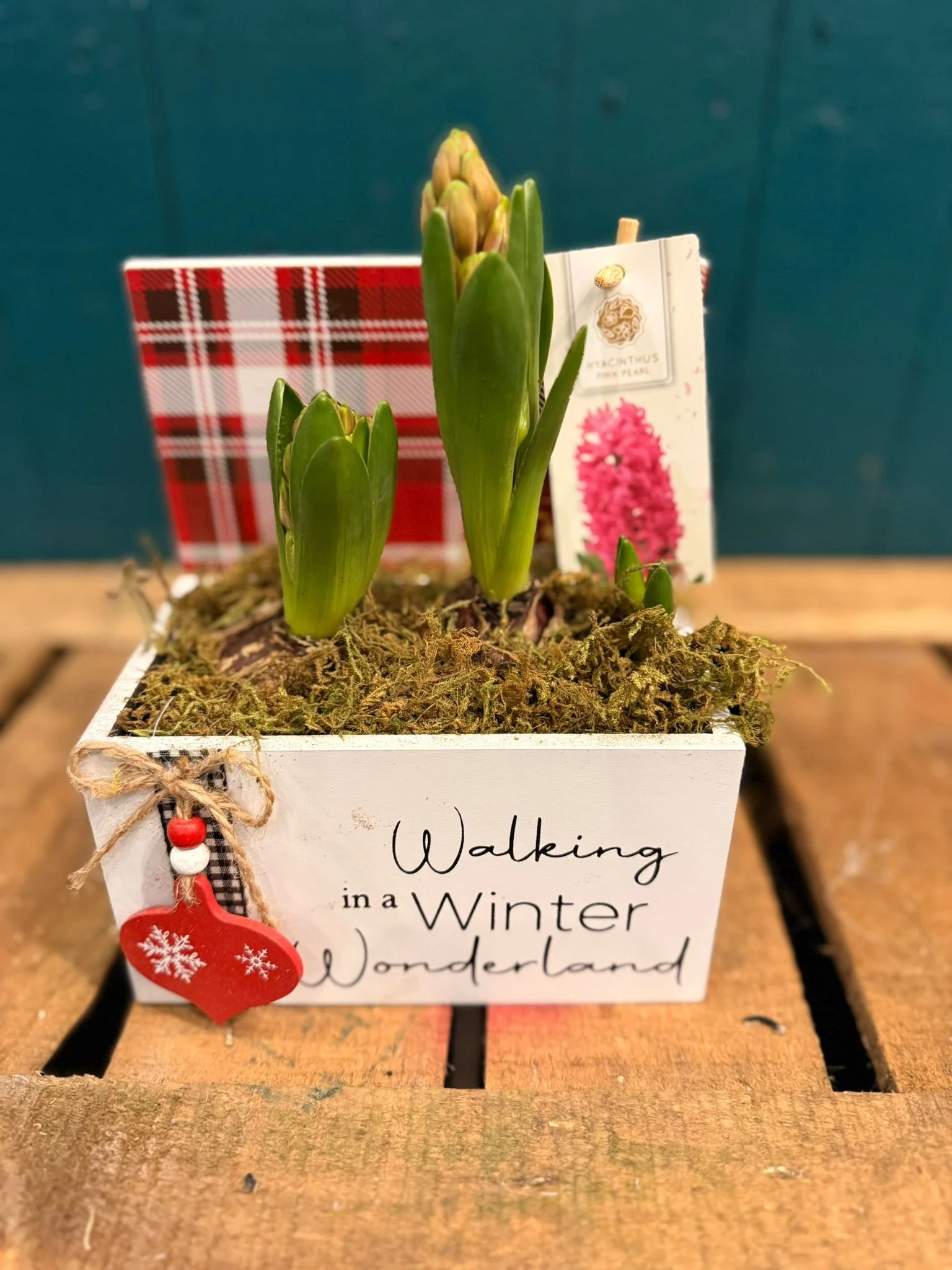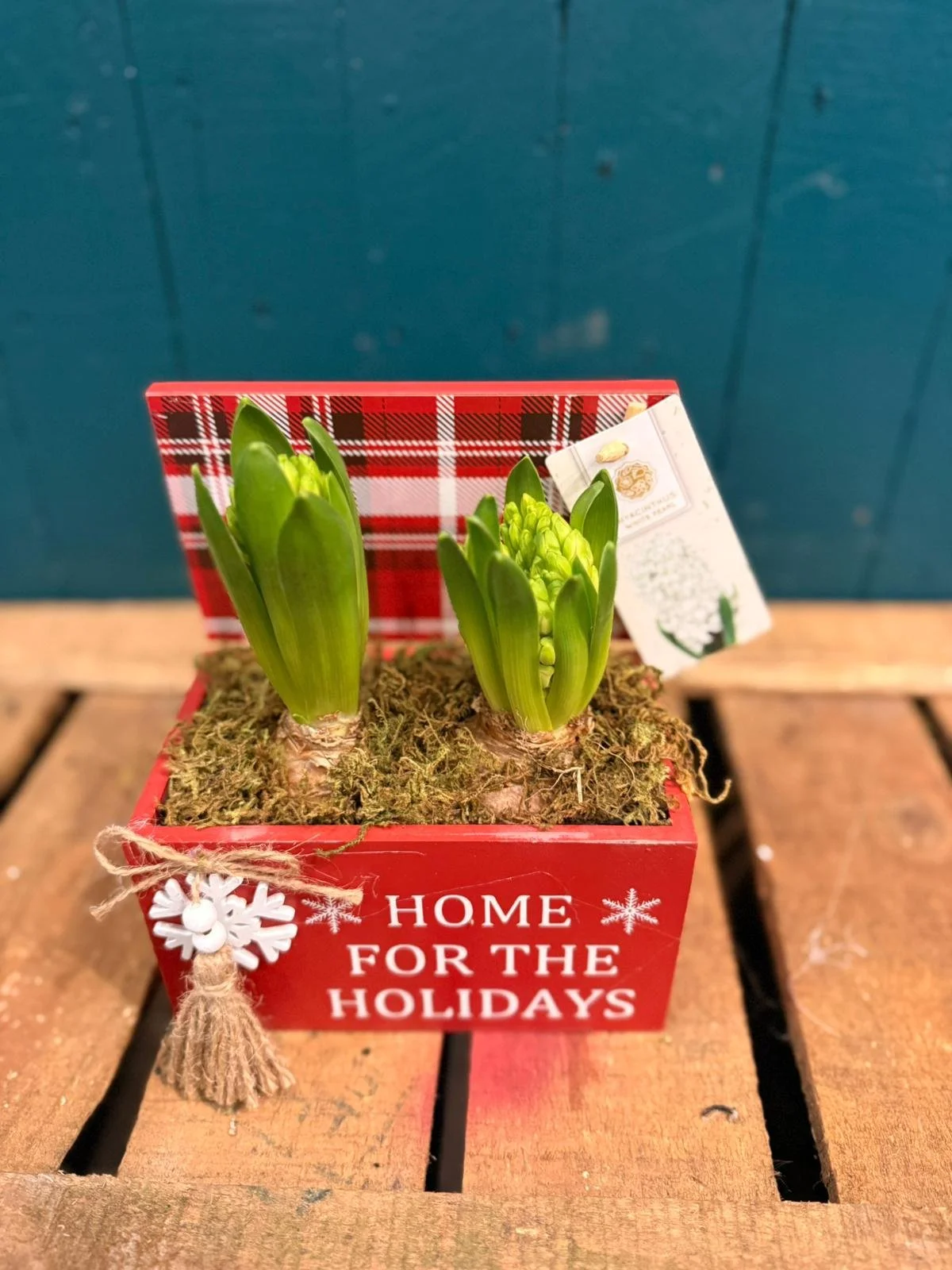 A wooden hinged box, a festive planed hyacinth bulbs, Made with love as , always, a perfect gift