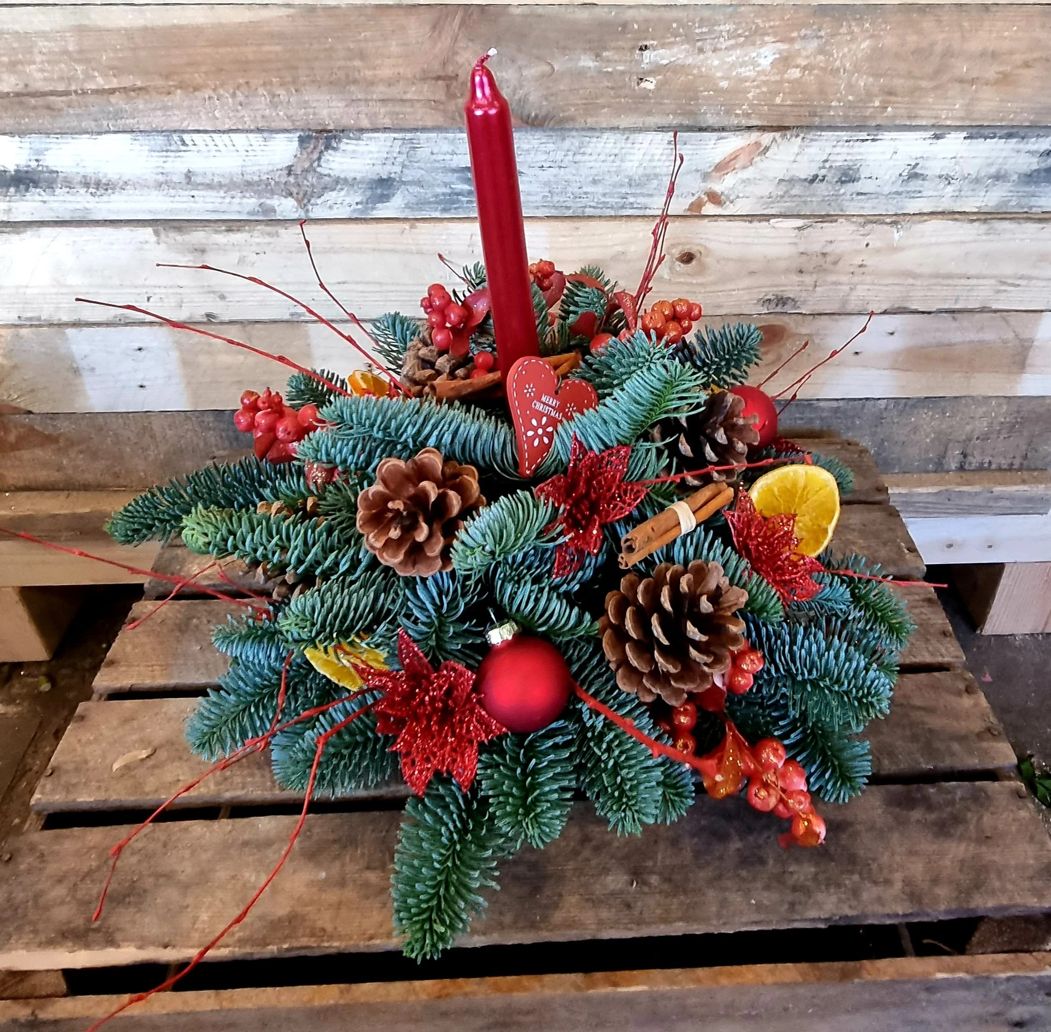 A beautiful hand crafted table centre piece, using a mixture of greenery including, holly, spruce, pine and conifer, along with complimentary colour matching candle.