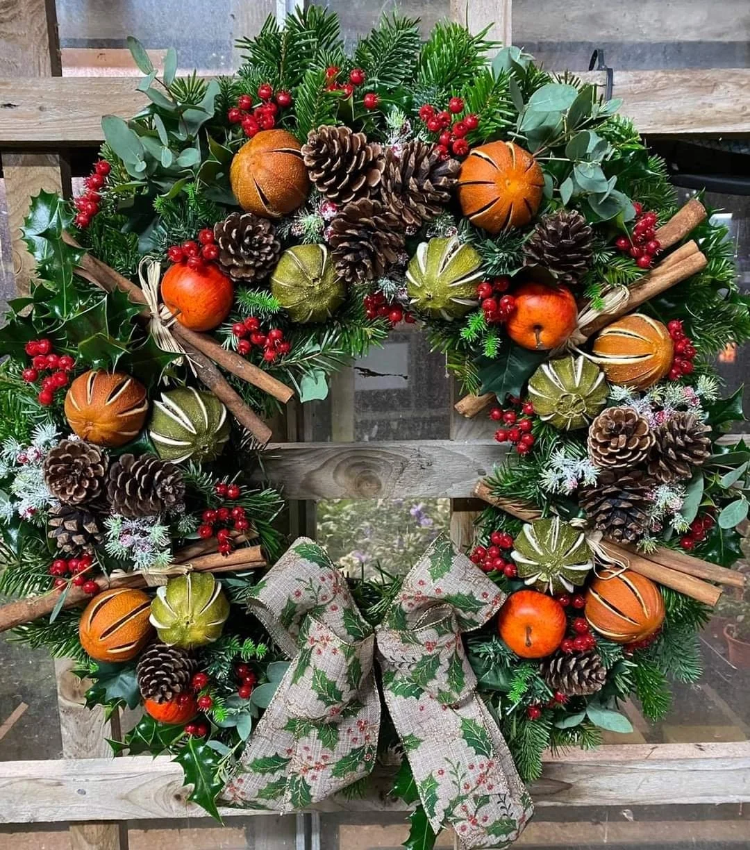 A loving handmade spruce & holly wreath with berries, pinecones , orange slices, cinnamon sticks and matching bow bow. The perfect wreath for any home.