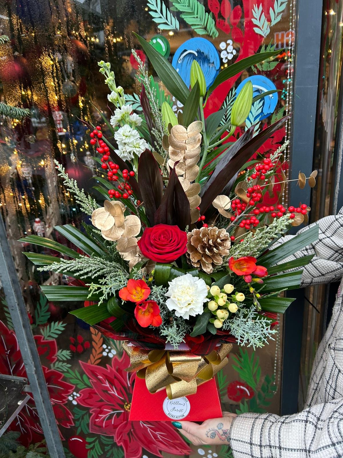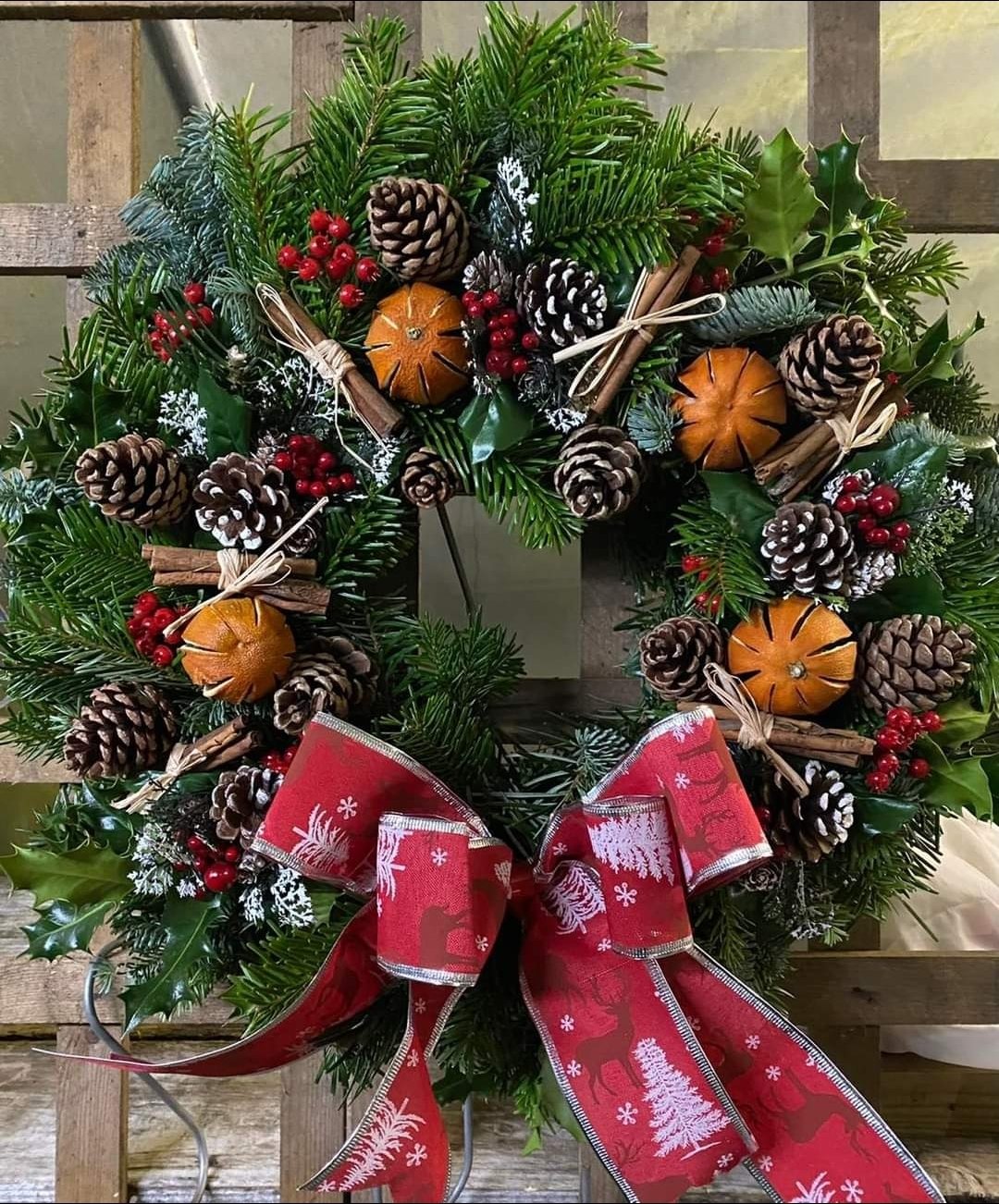A loving handmade spruce & hollywreath with berries, pinecones, cinnamon sticks and matching bow. The perfect wreath for any home.